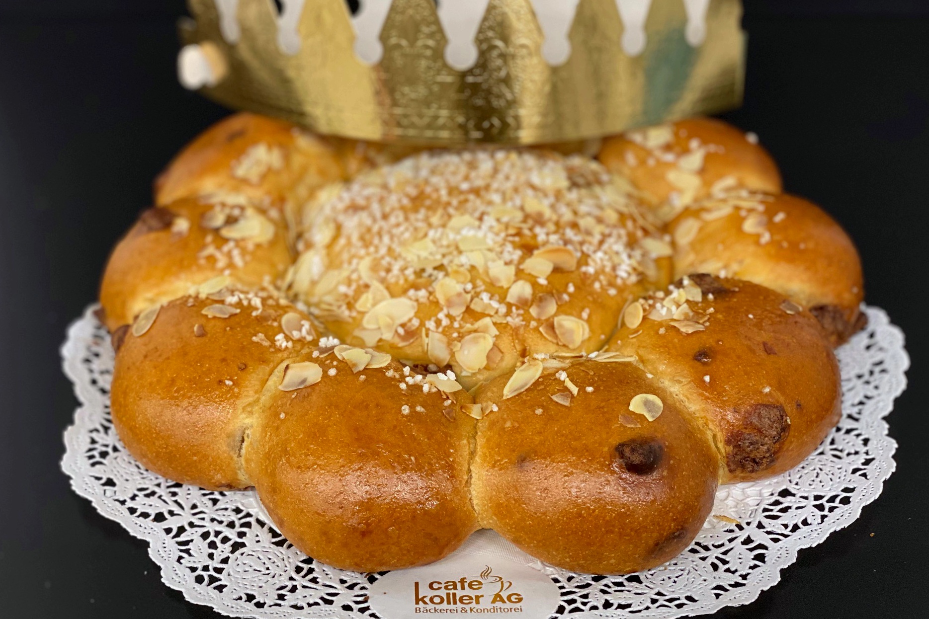 Traditionelles Gebäck mit Butter, Mandelmasse, Eier und Milchschokolade. Bestreut mit Hagelzucker und Mandeln. Ein Plastik-König ist in einem Aussenstück versteckt. Pro Kuchen wird eine Papierkrone mitgegeben.