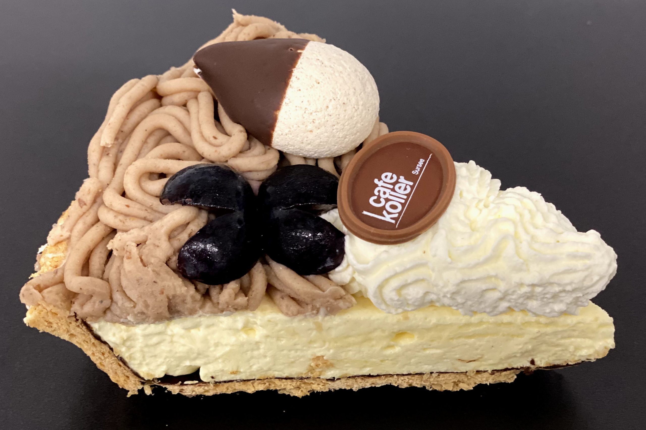Butterblätterteig gefüllt mit einer Diplomat Creme (Vanillecreme mit geschlagenem Rahm). Vermicelle aus Edelkastanien (mit Kirsch 40% Vol. verfeinert) auf dressiert. Mit einem Meringues und Trauben garniert.